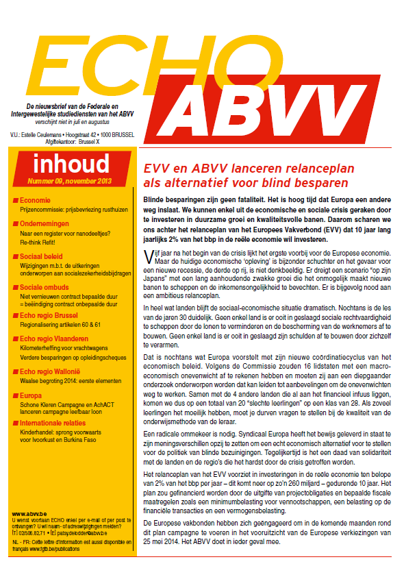 De nieuwsbrief van de studiediensten van het ABVV : EVV en ABVV lanceren relanceplan als alternatief voor blind besparen.