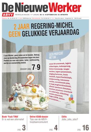 Ledenblad van het ABVV : 2 jaar regering-Michel geen gelukkige verjaardag | Boek 'Fuck Tina': er is wel alternatief | Online VDAB-dossier : tips van de ABVV-loopbaanconsulent | Edito : Jobs, jobs, jobs?