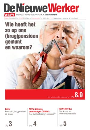 Oktober 2011 De Nieuwe Werker nr. 16 - 2011 ABVV-ledenmagazine: Armoede: Wie heeft het op ons (brug)pensioen gemunt en waarom | ABVV-senioren ondervroegen OCMW's: Hoe overleef ik mijn pensioen? | Power4you: goedkopere en meer ethische energie Andere publicaties Delen
