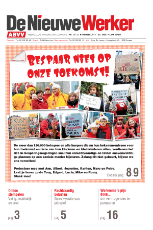 November 2014 De Nieuwe Werker nr. 19 - 2014 ABVV-ledenmagazine:Bespaar niet op onze toekomst! | Online stempelen : veilig, makkelijk en snel | Rechtvaardig belasten : geen kwestie van jaloezie! | Werknemers pijn doen ... om vermogenden te pamperen. Andere publicaties Delen
