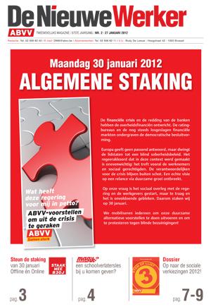 Januari 2012 De Nieuwe Werker nr. 2 - 2012 ABVV-ledenmagazine : 2012 - Maandag 30 januari Algemene staking | Steun de staking van 30 januari Offline én Online | Mag ik een schoolverlatersles bij u komen geven? | Op naar de Sociale verkiezingen 2012! Andere publicaties Delen