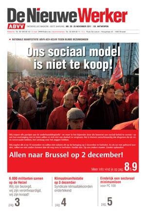 November 2011 De Nieuwe Werker nr. 20 - 2011 ABVV ledenmagazine : Ons sociaal model is niet te koop! | Allen naar Brussel op 2 december! 6000 militanten samen op de Heizel | Klimaatmanifestatie op 3 december | Eindelijk een sectoraal minimumloon voor PC 100. Andere publicaties Delen