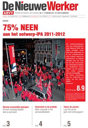 ABVV-ledenmagazine: 75% neen aan het ontwerp-IPA 2011-2012 | Oproep vrouwelijke getuigen: je loon vandaag bepaalt later je pensioen | Diversiteit in de praktijk: meer inspraak in personeelsbeleid | Laat het grote geld niet ontsnappen: teken de petitie.