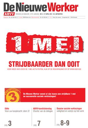 April 2012 De Nieuwe Werker nr. 8 - 2012 ABVV-ledenmagazine : 1 Mei 2012 Strijdbaarder dan ooit | Edito Voor uw koopkracht: stem 3! | ABVV-kandidatendag Charter van de delegee | Dossier sociale verkiezingen: veiligheid en welzijn op het werk. Andere publicaties Delen